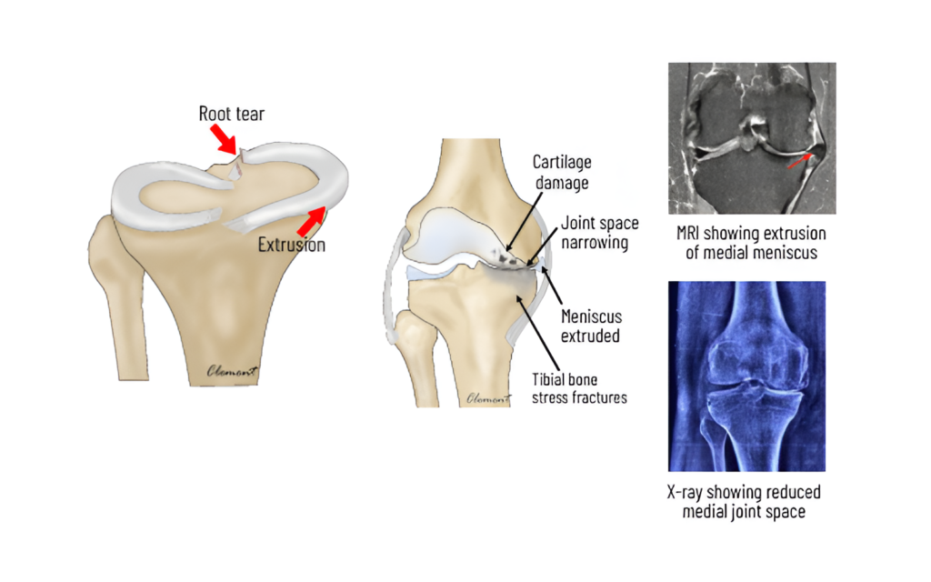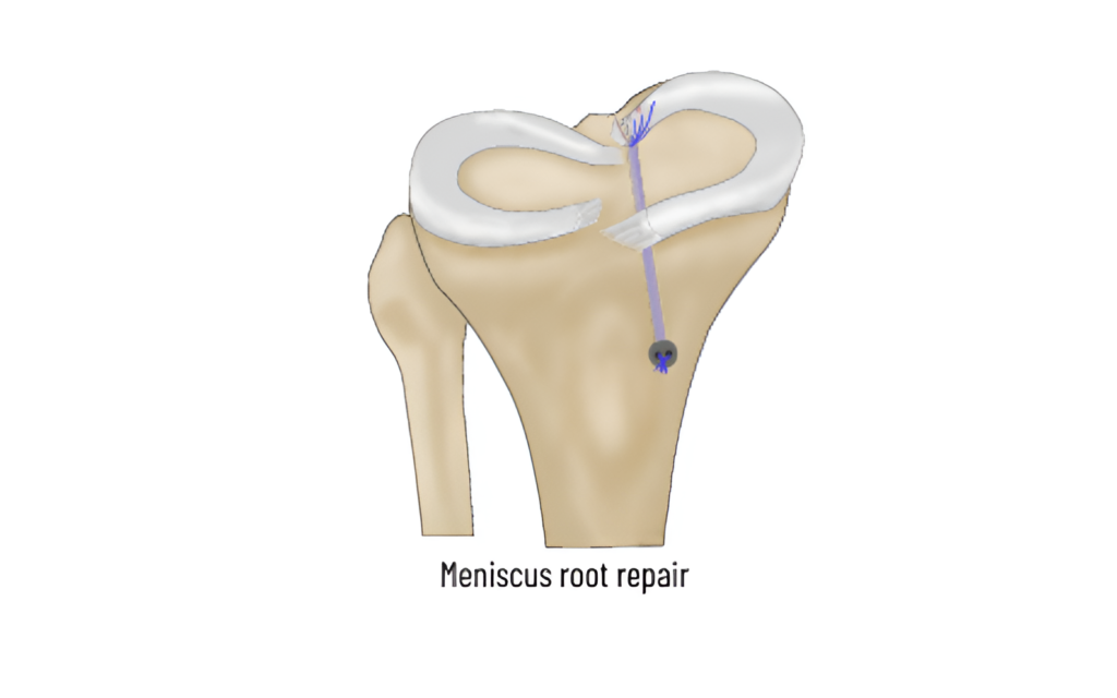 Root tear refers to detachment of meniscus from its bony attachment. It is a devastating injury as the meniscus is pushed out of the joint and shock absorption is completely lost . This results in overloading of the inner compartment leading to accelerated wear and tear ( arthritis)