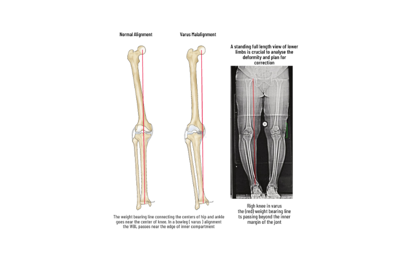 Faulty knee alignment (bow-leg or knock-knee) overloads one compartment, resulting in cartilage injury, meniscus tears and joint space narrowing. As the joint space reduces, the alignment also worsens leading to a vicious cycle of joint destruction and deformity. Fortunately correction of the alignment at an early stage can restore knee function and postpone joint replacement
