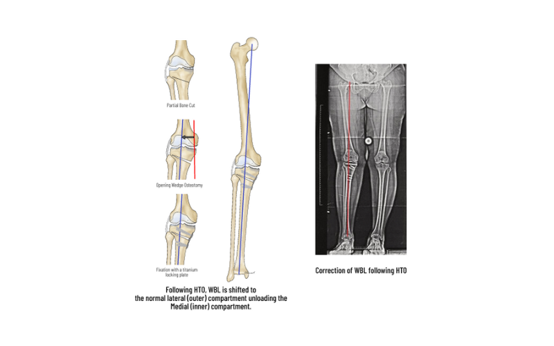 HTO is a procedure to correct the alignment and redistribute the load to the non-involved compartment. Arthroscopy is performed to assess the status of the joint and to treat meniscal tears, loose bodies, and cartilage tears. Based on preoperative planning and using precision instrumentation, a partial bone cut (osteotomy) is made in the upper tibia and is slowly opened to the desired level to shift the load to the normal compartment. The osteotomy is fixed with strong PEEK or titanium plates to allow early movements and weight-bearing. HTO also protects procedures like meniscus repair and cartilage repair by unloading the joint. HTO can postpone the need for knee replacement for many years.