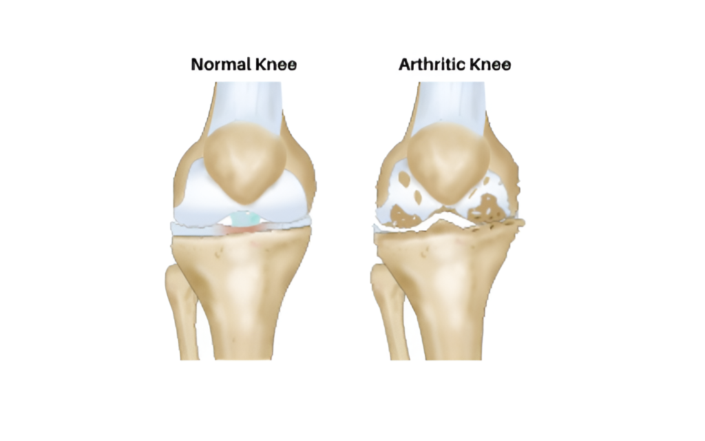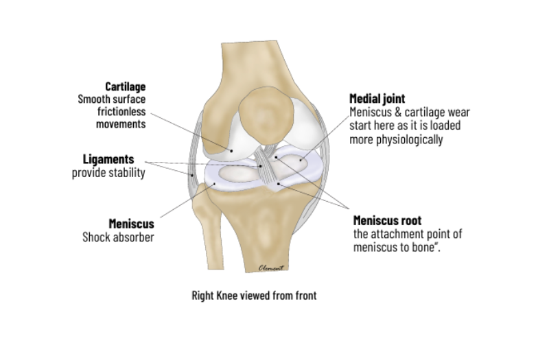 The knee joint is formed by Femur (thigh bone), tibia (leg bone) and patella Damage to the joint is called arthritis and is caused by Obesity, Meniscus tears, Malalignment (“bow-leg”) deformity overloading one compartment, instability (ligament tears) and rheumatological disorders.